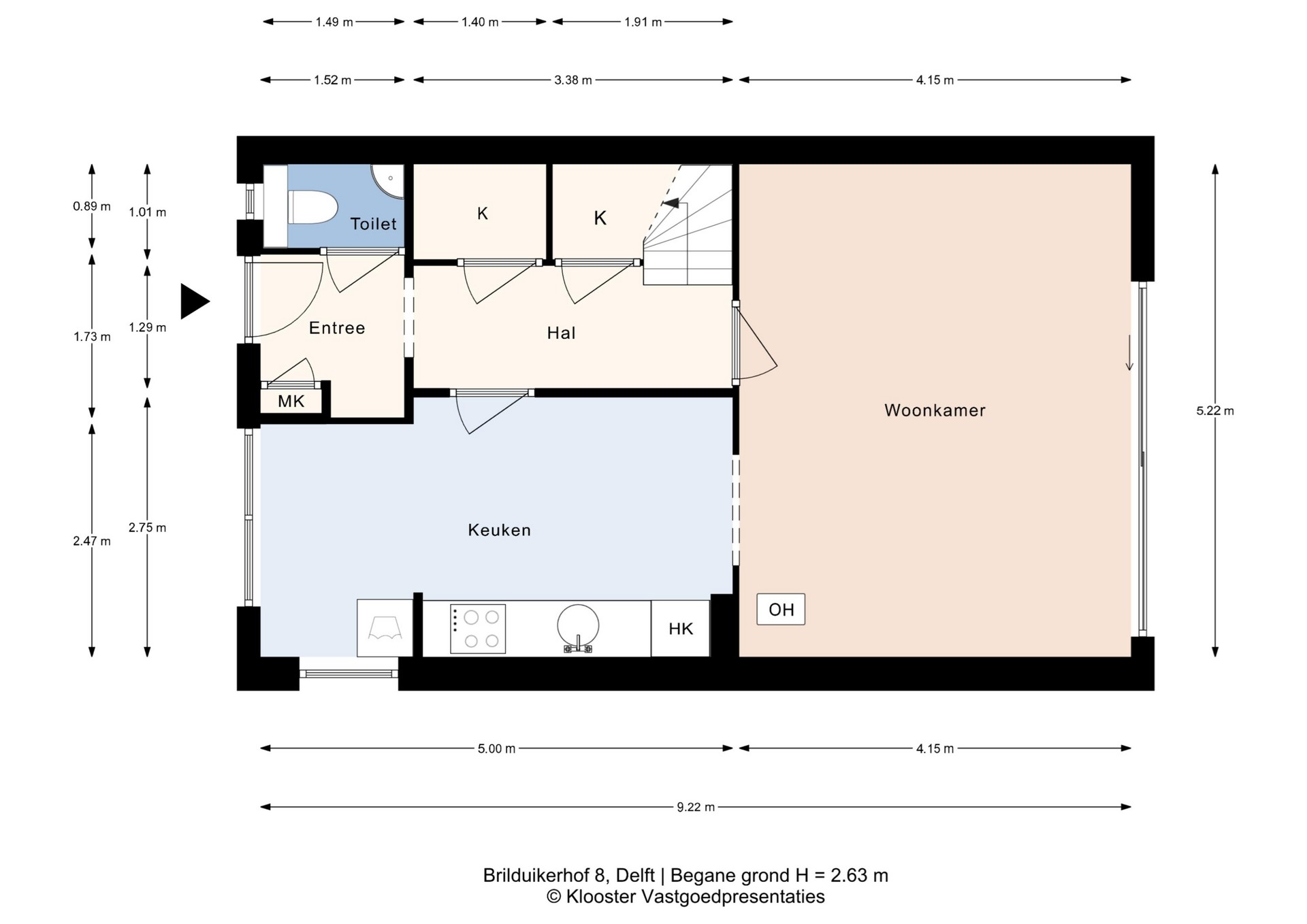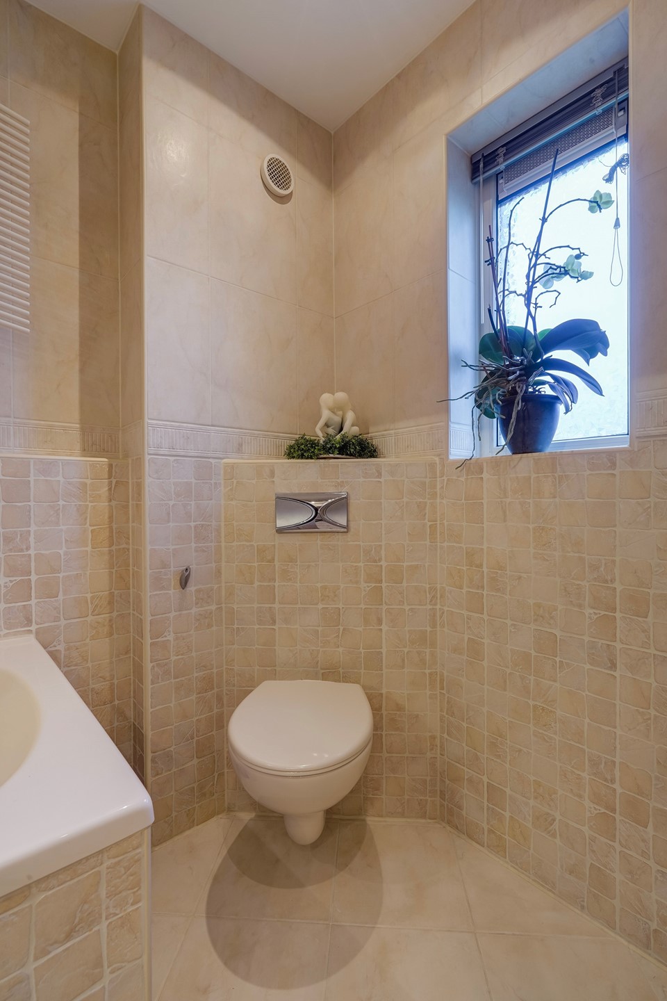 Entree/hal met meterkast (4 groepen, fornuisgroep en 1 aardlekschakelaar), garderobe en een moderne toiletruimte met hangend closet en fonteintje.