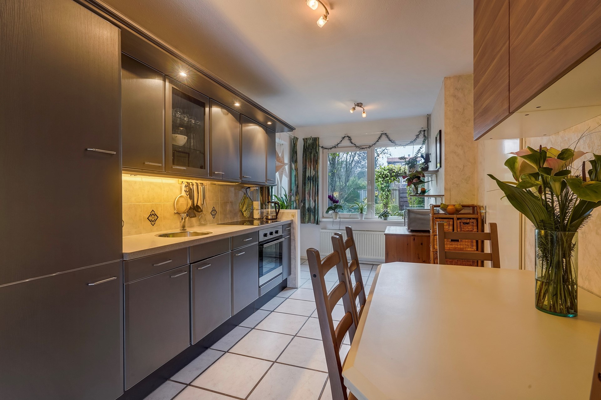 De open keuken bevindt zich aan de straatzijde en is uitgerust met diverse inbouwapparatuur, waaronder een inductiekookplaat, oven, afzuigkap, koelkast en vriezer.