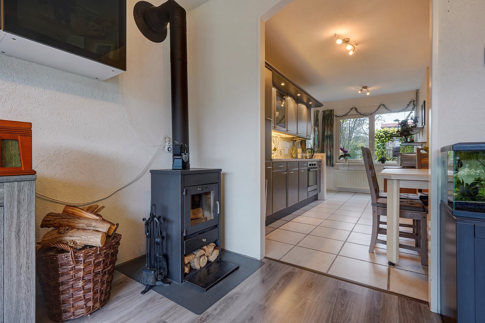 De woonkamer aan de tuinzijde is heerlijk licht, voorzien van een laminaatvloer en een sfeervolle houtkachel, en biedt direct contact met de tuin.