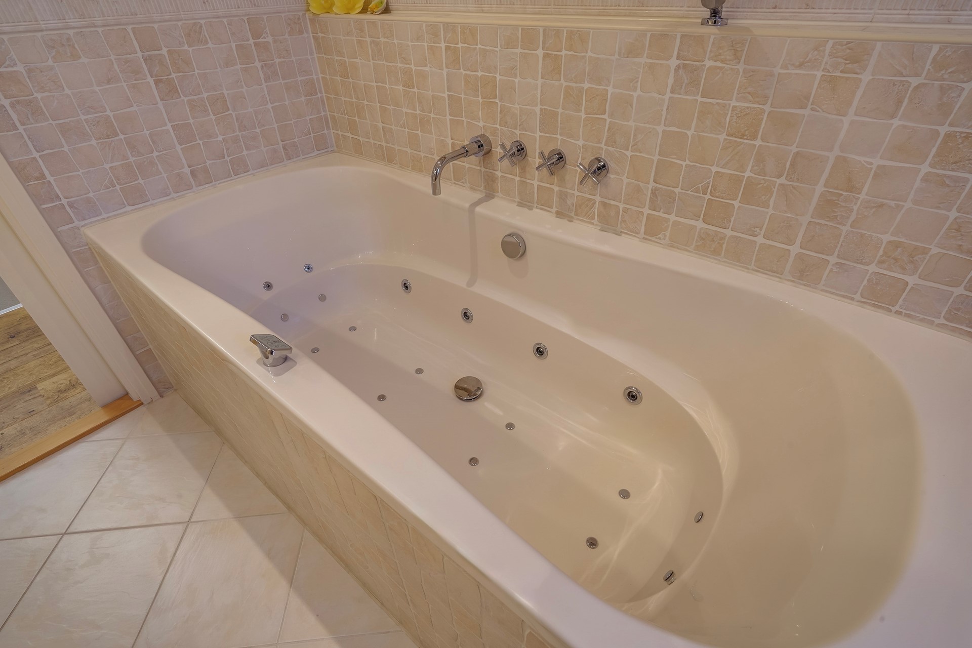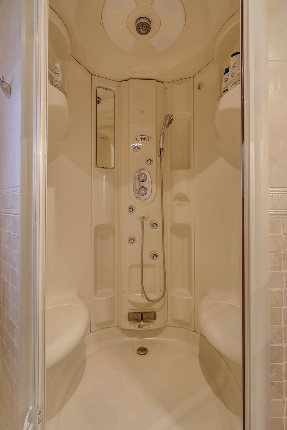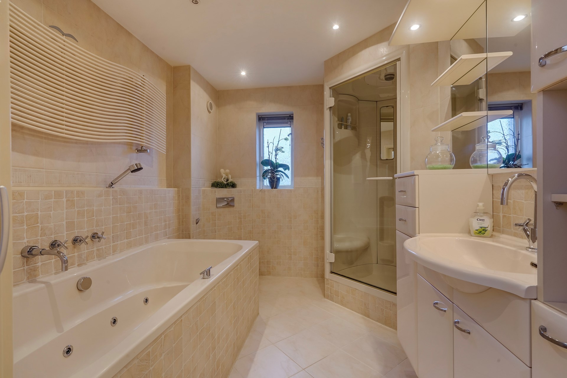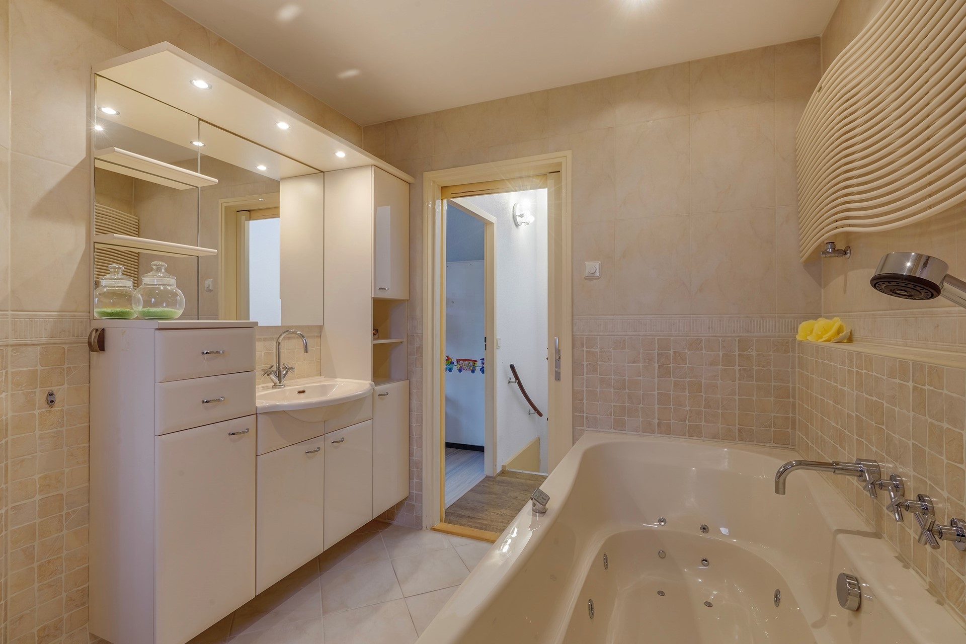 De badkamer is compleet uitgevoerd met een ligbad met jacuzzi, douchecabine, hangend closet en wastafelmeubel.