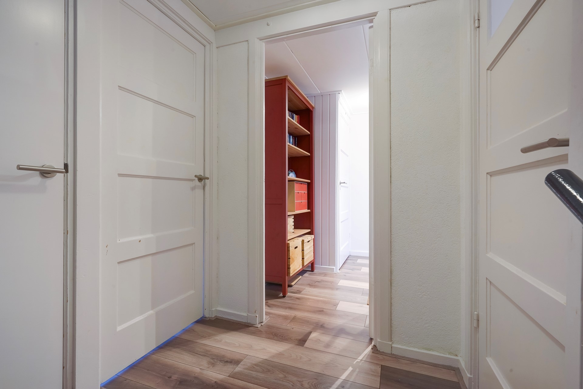 Overloop met vaste trap naar de tweede verdieping en een opstelplaats voor wasmachine en droger. Aan de achterzijde bevindt zich een slaapkamer met inbouwkast. Aan de voorzijde ligt een tweede slaapkamer met kunststof kozijn.