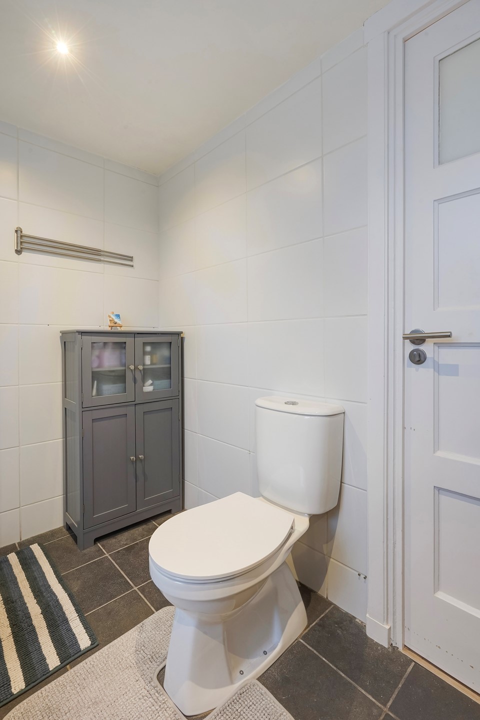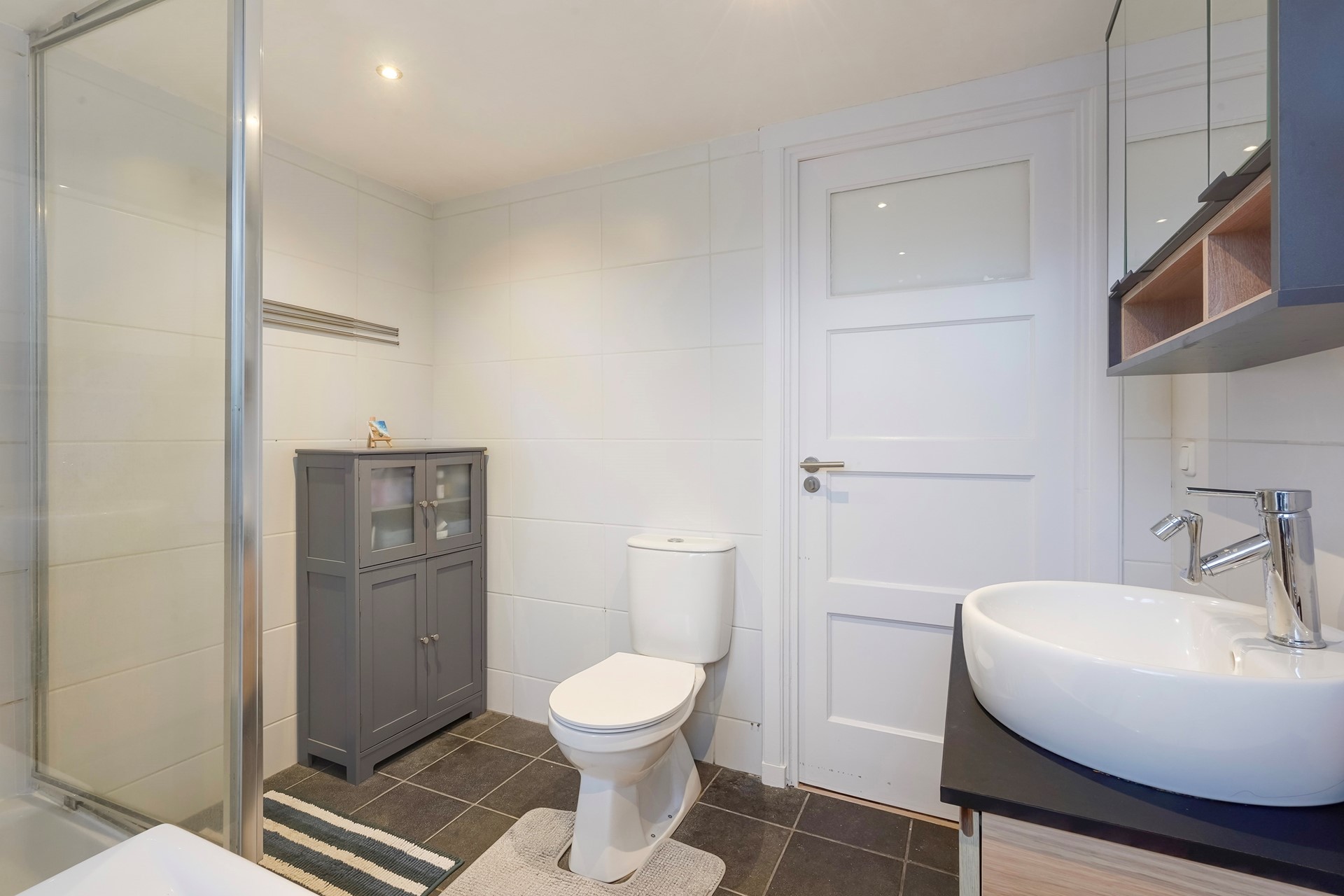 De badkamer is compleet uitgevoerd met ligbad, instapdouche, toilet, wastafelmeubel en handdoekradiator.