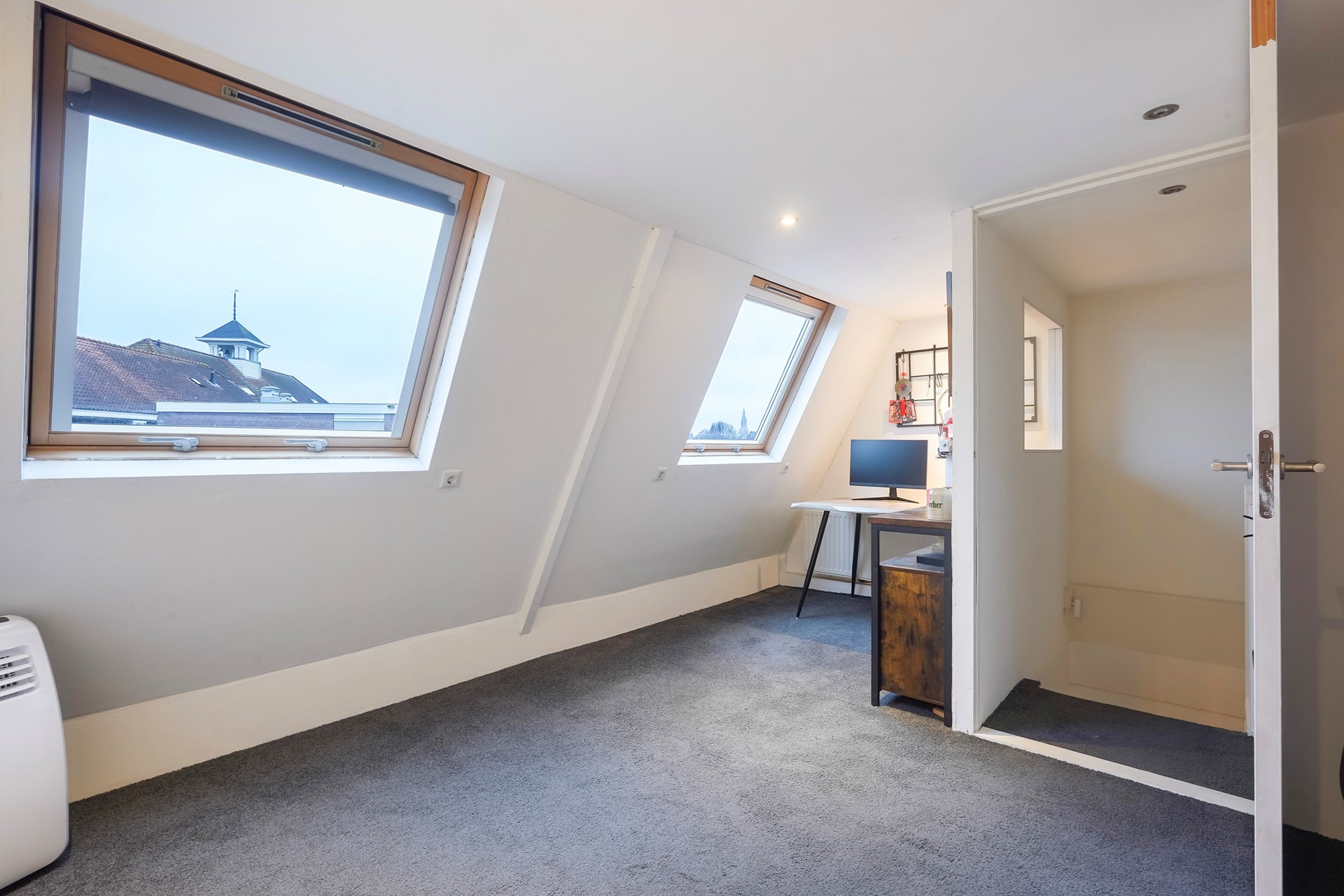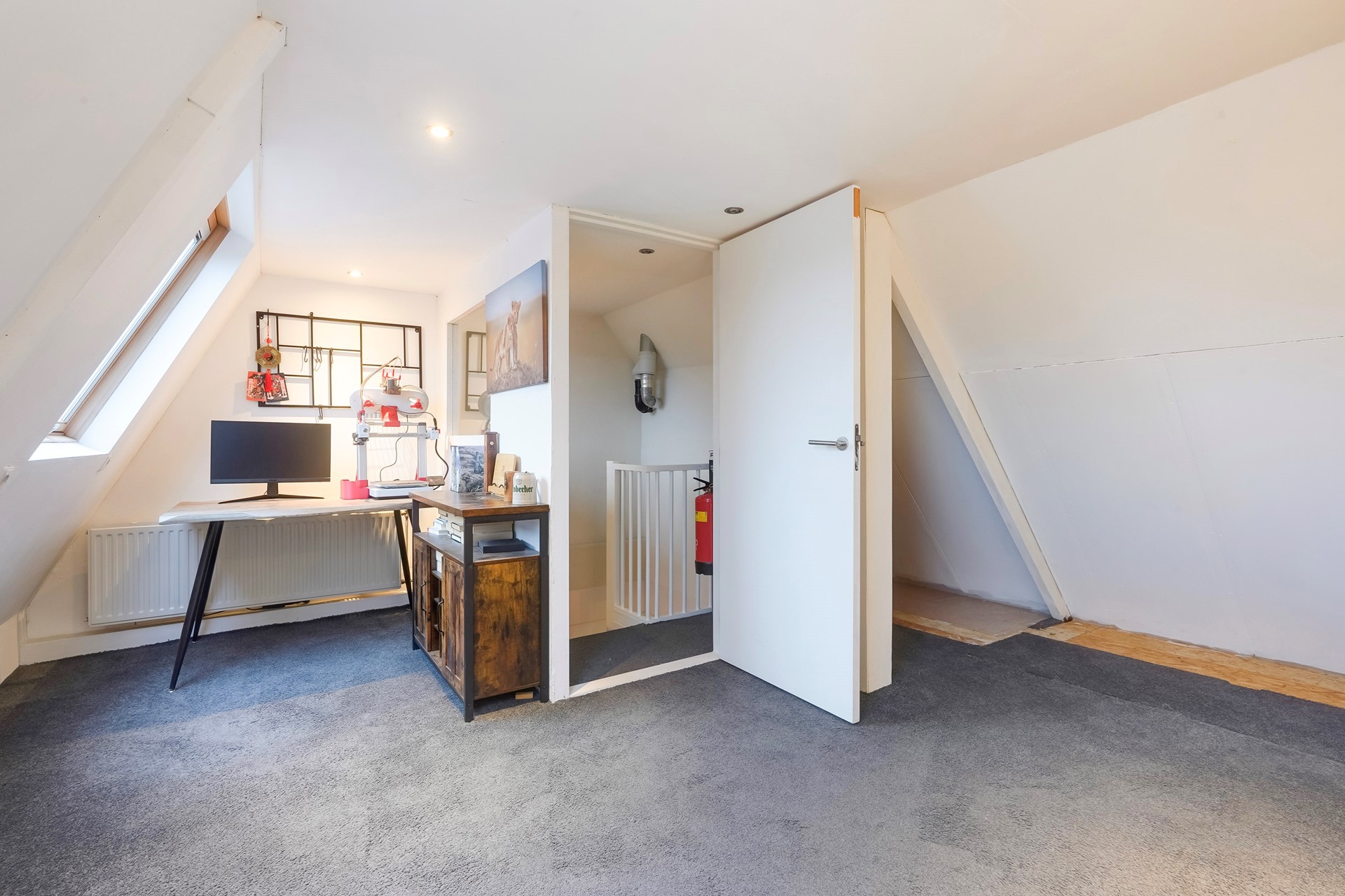 Overloop met toegang tot de zolderkamer, geschikt als slaap- of hobbyruimte. Deze kamer is voorzien van twee tuimelramen aan de achterzijde.